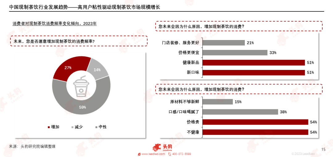 伴随高频高质的产品迭代和茶饮消费频率提升,茶饮消费市场市场规模有望进一步扩大。调研结果显示,超80%的受访者倾向于认为未来会保持和增加现制茶饮的消费频率,新口味和健康新品的推出以及更高性价比是驱动其增加消费的主要因素,而不健康、价格贵制约了现有消费者消费频率的提升,品牌方可在产品创新和健康化等方向持续发力,为消费者提供更具性价比的产品。现制茶饮消费具有高频、高人群基数的特征,且具有较高的成瘾性,伴随着高频高质的产品迭代和消费习惯的进一步培育,消费频率的提升将推动现制茶饮市场扩容。