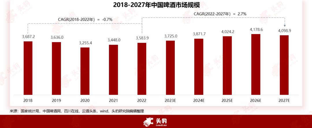 中国啤酒行业市场规模于2020年触底反弹,量价齐增,叠加消费升级赋能行业向更高端化发展,未来零售价格有望持续增加,预计2027年规模将达到随着人口老龄化趋势的加剧,以及白酒、葡萄酒等其他酒类产品对市场份额的挤占,中国啤酒行业的规模在2013年之后开始逐渐见顶,产销量双双下降,市场规模也呈现出不断萎缩的趋势。