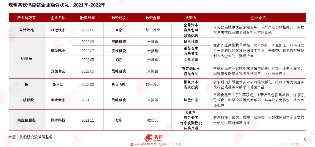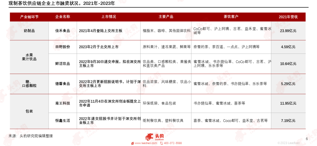 此外,供应商企业对核心客户存在一定依赖性。现制茶饮上游原材料市场相对分散、技术壁垒不高,相对于茶饮品牌方,原材料供应商议价能力弱。大部分供应链企业的前五大客户集中度高,具有客户稳定性风险,若未来主要客户流失,将会影响公司营收,这样的压力驱动供应商陆续登陆资本市场,提升抗风险能力。