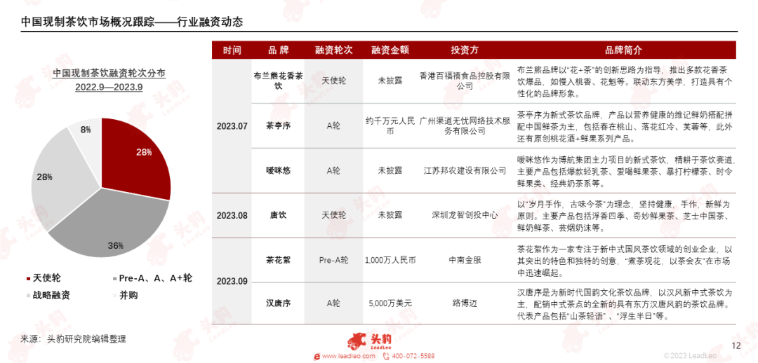 在中国现制茶饮行业竞争白热化的背景下,于近期获得融资的新兴茶饮品牌通常从一个较细分的市场切入,在获得融资后,进一步扩大产品矩阵和门店数量。国风茶饮为2023年第三季度热门细分市场,如茶亭序以营养健康的维记鲜奶搭配拼配中国鲜茶为主,汉唐序以汉风新中式茶饮为主配销中式茶点,差异化品牌形象使得品牌在细分市场竞争中脱颖而出,被资本看好。