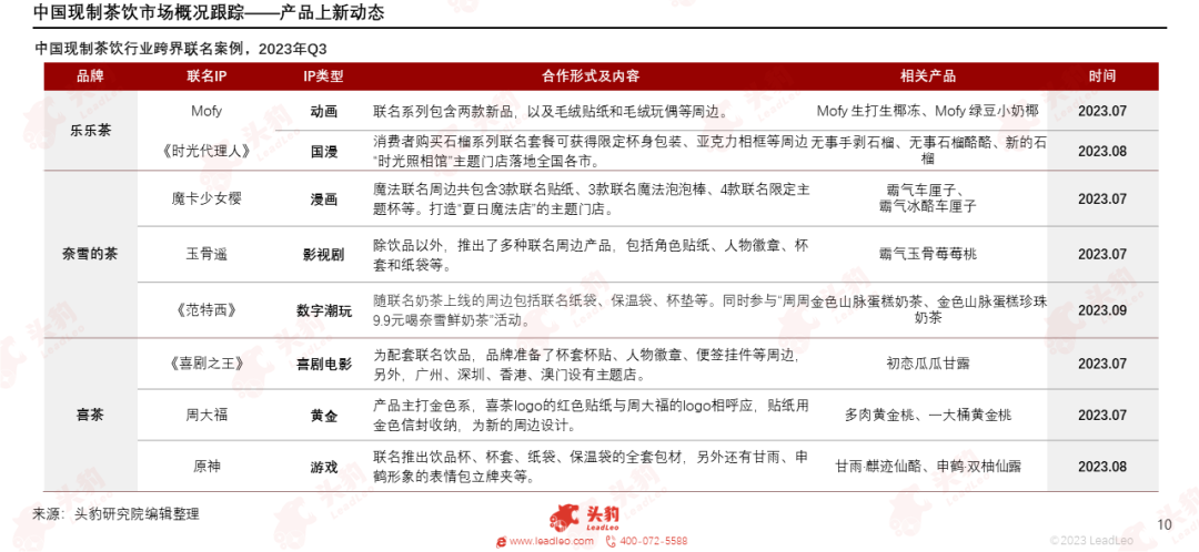 从品牌营销动态来看,茶饮品牌产品上新结合跨界联名、限量周边、主题门店,反响热烈。2023年第三季度热门IP类型包括动画、漫画、潮玩、游戏等。受众范围较广,更贴近消费者,实现流量带动销量。