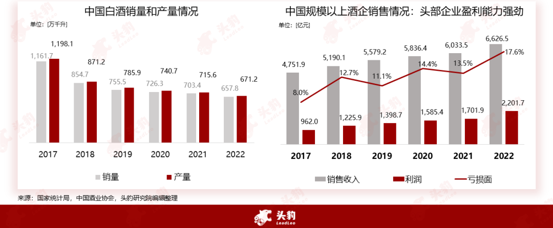 从规模以上酒企销售情况来看,中国白酒的销售收入在2022年达到6,626.5亿元,利润为2,201.7亿元,呈现出逐年攀升的趋势。尽管中国白酒产量和销量不断下降,中国规模以上酒企的利润和销售额水平不断上涨,其中主要原因在于消费者对高价位白酒的需求增加,体现出白酒消费的品质化趋势。2022年中国白酒规模以上企业共亏损18.8亿元,截止2022年,中国白酒规模以上企业一共963家,亏损面为17.55%。尽管白酒行业整体持续盈利,但是白酒行业的亏损面数值也不断上涨,行业中仅有部分头部企业持续盈利,多数企业依旧面临改革调整。
