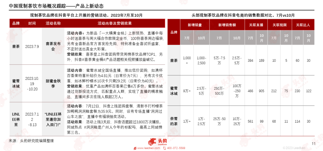 中国现制茶饮的竞争蔓延至抖音团购,并且围绕价格及内容方面展开。在价格方面,包括喜茶、蜜雪冰城在内的众多茶饮品牌,纷纷开启价格战,例如蜜雪冰城推出满杯百香果特惠价格低至4.81元的活动。在内容方面,喜茶为新品一大桶黄金桃准备符合主题的金喜试听盛宴直播,以新颖的直播方式为产品推广增加话题度。各品牌在抖音平台销售额随着关联直播、关联视频、关联达人的投入而变化。我们可以看到在7-10月期间,蜜雪冰城关联视频及达人数量减少,关联直播数量增加,相关活动处于预热阶段。另外,喜茶及奈雪的茶营销热度不减。