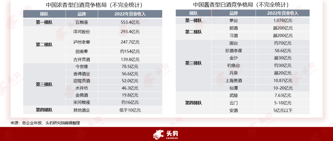 白酒行业的上市企业中,贵州茅台和五粮液的白酒业务布局最广、营业收入最高,是中国白酒行业中的第一梯队龙头企业。