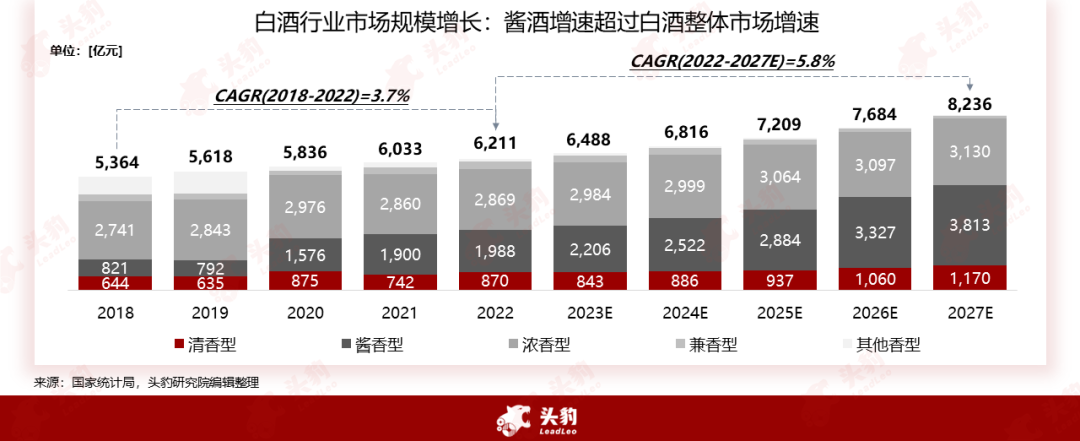 从白酒的市场规模数据上看,中国白酒行业市场规模从2018年起稳定上涨,从5,364亿元增长到2022年6,211亿元,年复合增长率为3.7%。中国白酒行业预计至2027年市场规模将会增长至8,236亿元,未来五年的年复合增长率预计为5.8%。