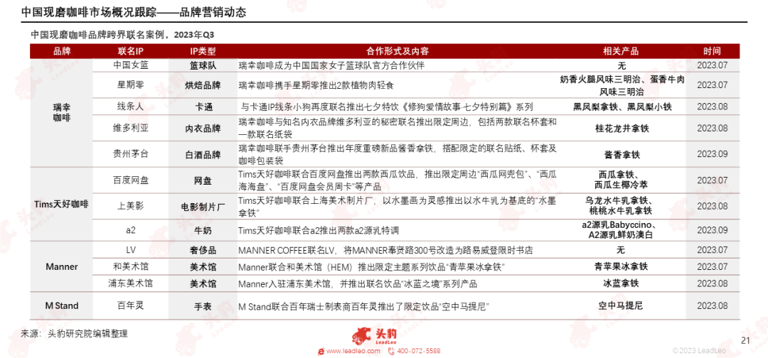 连锁现磨咖啡品牌的跨界联名成为营销、上新的常态化手段,相比于上半年每季度1-2次跨界联名的频率,三季度的联名频率进一步加快,头部品牌基本实现每月一次的跨界联名,其中瑞幸咖啡、Manner等品牌合计与超过5个品牌进行联名。从联名品牌看,三季度的联名品牌反差感极强,令消费者出其不意,如瑞幸咖啡与贵州茅台、瑞幸咖啡与维多利亚的秘密、Manner与LV、M Stand与百年灵等联名,其特征是联名品牌均为高端品牌,与走平价路线的咖啡品牌形成极大反差感,为消费者带来独特的体验和全新的元素感知,从而帮助咖啡品牌提升品牌形象,加强不同消费圈层之间的联系,弥补因价格战带来的品牌廉价感。