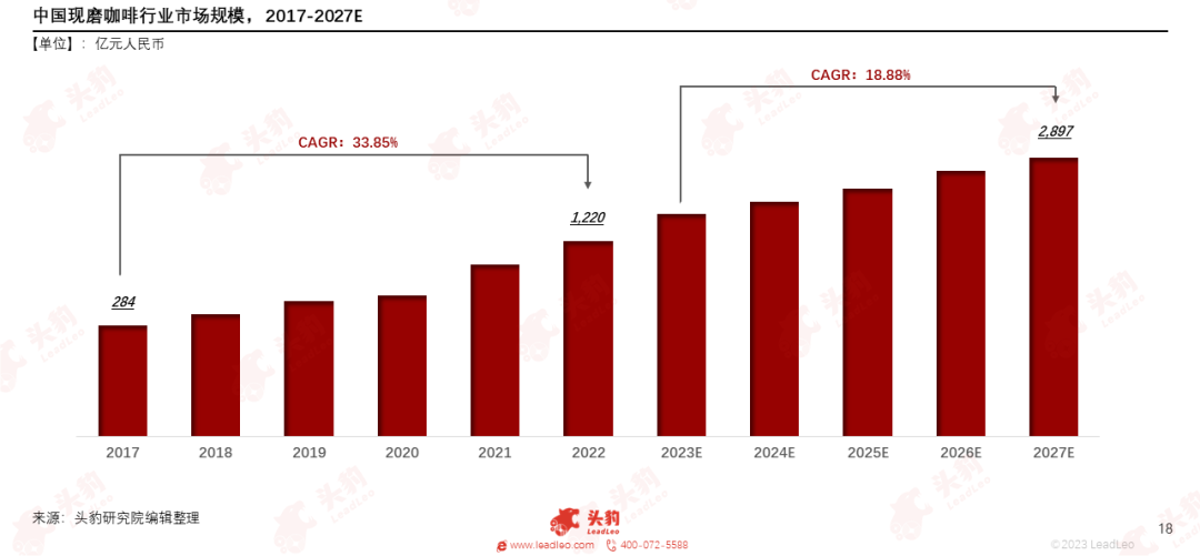 中国的现磨咖啡行业发展前景明朗,开发潜力较大。市场规模由2017年的284亿元增长到2022年的1,220亿元,年复合增长率达33.85%,市场呈现迅猛发展态势。随着人们消费观念的转变以及消费主体的更新,新中式咖啡解锁文化消费需求,加上互联网的宣传,现磨咖啡行业将有望进一步增长。预计2027年市场增长至2,897亿元,5年年复合增长率为18.88%。
