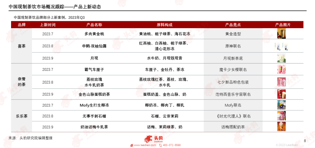 从产品上新动态来看,进入2023年第三季度,茶饮品牌创意方向以经典水果元素为主,结合秋季热点,主打差异化饮品。近50家现制茶饮头部品牌每月合计上新款数量,在剔除咖啡类新品后,分别为180款、155款和155款。新品创意方向以柠檬、椰子、桃子等经典元素为主,应用方向灵活,蓝莓、青提等新水果元素频繁上架。石榴、柿子等秋季水果热度上升,牛油果、榴莲等高价水果元素延伸至下沉市场。此外,进入秋冬季节,新品茶底特征突出,轻乳茶抢先上架,茉莉绿茶底最为经典,栀子绿茶关注度上升,茶饮品牌集中推广,奶茶新品数量大幅增加。