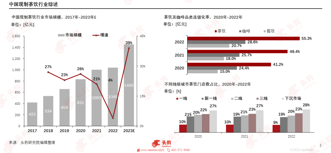 历经了三十余年的发展,目前,中国现制茶饮行业逐渐迈入成熟期的上半段,进入存量竞争的阶段。从市场增速和门店增速来看,经历高速发展阶段后,中国现制茶饮行业市场规模于2021年已突破千亿元;2020-2022年受外部因素影响,现制茶饮的市场增速和门店增速双双放缓,2022年,中国茶饮品类门店增速显著低于咖啡品类,但茶饮品类连锁化率进一步提升,这一年现制茶饮品牌连锁化率达55%,远高于咖啡和餐饮品类,现阶段茶饮连锁品牌成为市场主流。从门店发展来看,一线及新一线茶饮市场趋于饱和,三线城市及以下的下沉市场稳步发展。以上种种迹象表明,现阶段中国现制茶饮行业趋于成熟,进入下半场竞争阶段,存量市场的竞争将更为激烈。