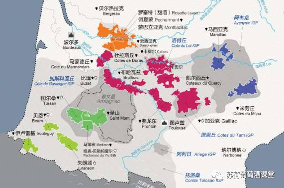 1、贝吉哈克:又译为贝尔热拉克,有波尔多后花园的美誉。位置示意图中最北部的橘黄色部分就是这个产区的涵括范围,我们可以看到罗塞特、佩夏蒙、蒙巴利亚克(这个地方出贵腐甜白)都在这个范围之内。主要的红葡萄品种和波尔多是重合的,诸如赤霞珠、品丽珠、梅洛、马尔贝克,并且赤霞珠的质量还很好,所以很多贝吉哈克出品的以赤霞珠为主混酿的红葡萄酒,做好了很难尝出来跟波尔多同质产品的区别。主要的白葡萄品种也跟波尔多差不多,分别是赛美蓉、长相思、密斯卡岱、昂登和白诗南。
