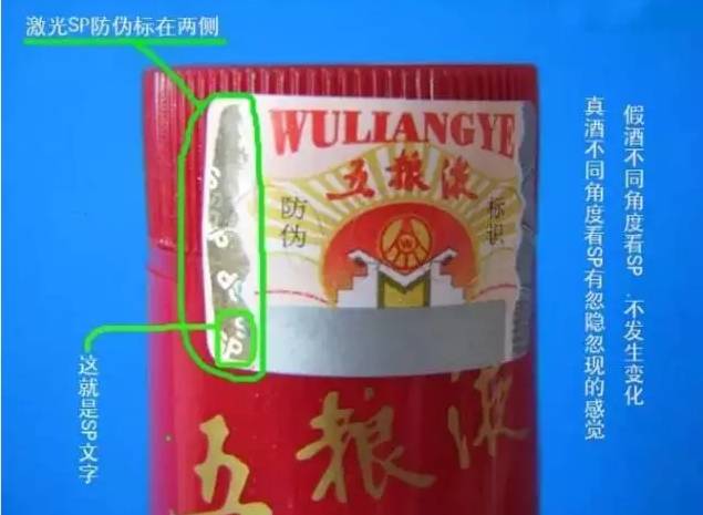 真酒瓶盖上有PET聚酯盒防伪标识,内盖扯开后便不可复原。醒目的“五粮液”三个大字也是作为一种特殊识别标志,商标图案底部用黄色谷穗衬映,谷穗以上全部套红,“五粮液”三个字是谷穗图形略凸起,商标背面印有出厂日期,透过酒液和瓶体就能看清楚。专用防伪标识采用特殊的一次性材料制作,在自然光下,可以清晰地看见防伪标识上印有红色的“五粮液”图案,还印有“SP”英文字母,变换酒瓶角度,字母时隐时现。电码防伪标识有涂层区域可以刮开,有22位数字的防伪码,这22位查询数字与外包装的数字不一样,可以登录五粮液的查询网查询或者拨打电话查询。剑南春