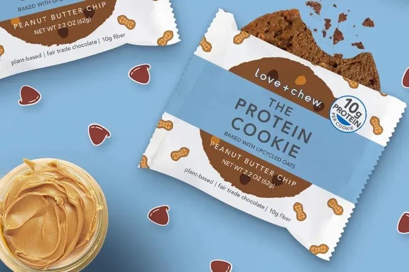 以女性为主导的植物性食品公司“Love + Chew”与升级再造食品公司“Renewal Mill”合作推出了“The Protein Cookie”,这是一款花生酱夹心曲奇饼干,由 Renewal Mill 的升级回收燕麦奶粉烘烤而成,产品以真正的花生酱、鹰嘴豆粉、燕麦奶粉和杏仁粉为特色。