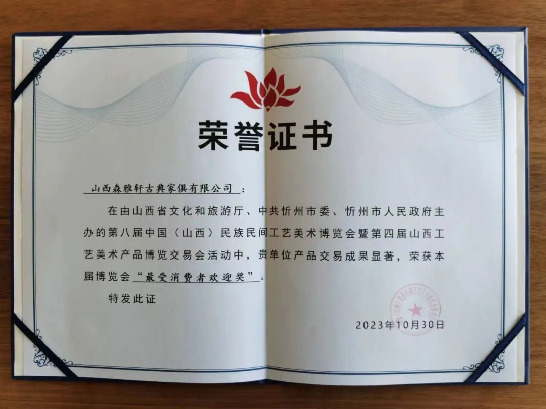 展出期间,山西森雅轩古典家具有限公司开展了网络直播、创造了本次艺博会展出古典与现代完美融合的典范、广受好评。并获得了组委会颁发的“最受消费者欢迎奖”。