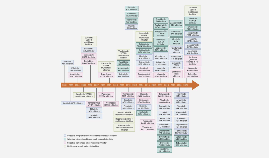 截至2022年8月5-11日,美国FDA批准用于肿瘤适应症的小分子抑制剂有88种,首次发表:2022年10月13 资料来源:https://doi.org/10.1002/mco2.181