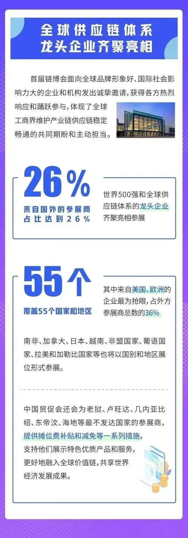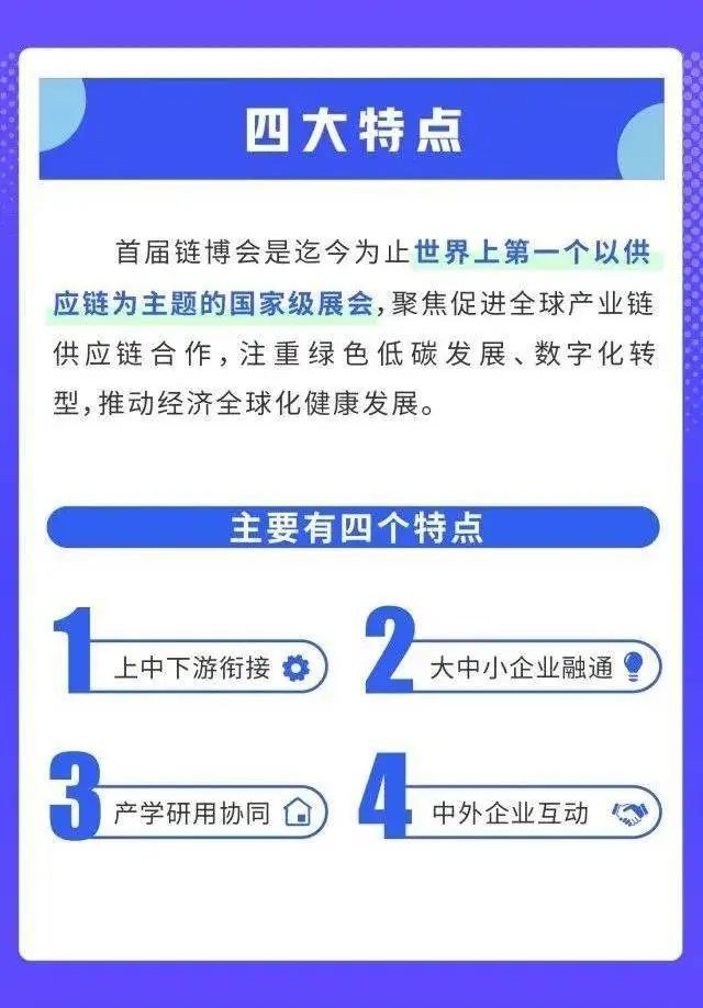 首届链博会不仅邀请了中外企业参展参会,也向社会大众开放。我们前3天是专业观众日,后2天是普通观众日,最后一天正好是周六,非常欢迎普通民众到链博会来看一看,因为链博会除了专业供需以外,也是一个具有科普性的展览,把每一条链中从上中下游到横向服务全面展开,拼在一起这些企业最先进的产品和技术,构成了一幅未来的产业链全景图。非常适合专业学校的师生,包括普通民众去感受。特别是昨天我在做一个节目的时候,也是问到我有什么适合普通民众来感受的,我说先推荐大家去看看健康生活链,从孕期、出生到养老,全生命周期,这个和老百姓的生活息息相关。还有很多试吃、试喝、品尝活动。