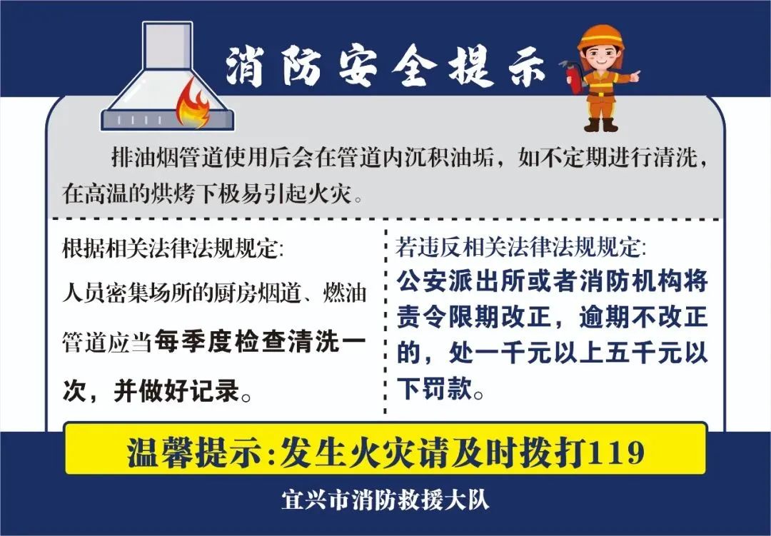 本次排查重点是有油烟管道的餐饮场所、工业企业食堂、机关单位食堂,重点突出大型商业综合体、宾馆饭店、“九小”餐饮场所等人员密集场所。根据《中华人民共和国消防法》《人员密集场所消防安全管理》《江苏省消防条例》《江苏省高层建筑消防安全管理规定》及其他有关规定,餐饮场所的经营者应当对排油烟设施每季度至少清洗1次,烧烤、烤肉等炭烤类场所的油烟管道宜每2个月至少清洗1次。