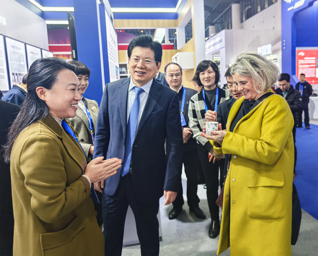 当天上午,出席成都第九届中国国际版权博览会的中宣部副部长张建春、世界知识产权组织副总干事西尔维·福尔班参观国家馆,为瑞牛文创设计开发的版权作品——四季物语青花玲珑香薰点赞。