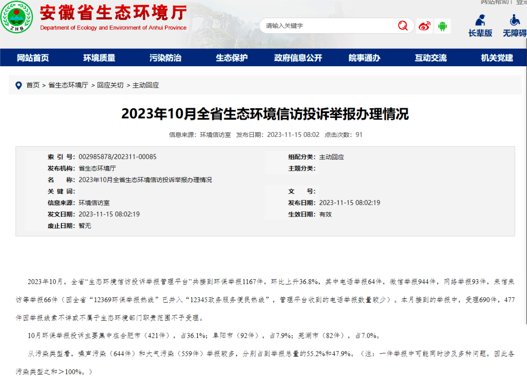大气重污染成因来源与控制已成为社会广泛关注的热点问题之一。根据安徽省“12369”环保举报办理情况显示,2023年10月共接到环保举报1167件,环比上升36.8%,其中大气污染举报较多,占到举报总量的47.9%。举报最为集中的行业为:餐饮业、建筑业、畜牧业。