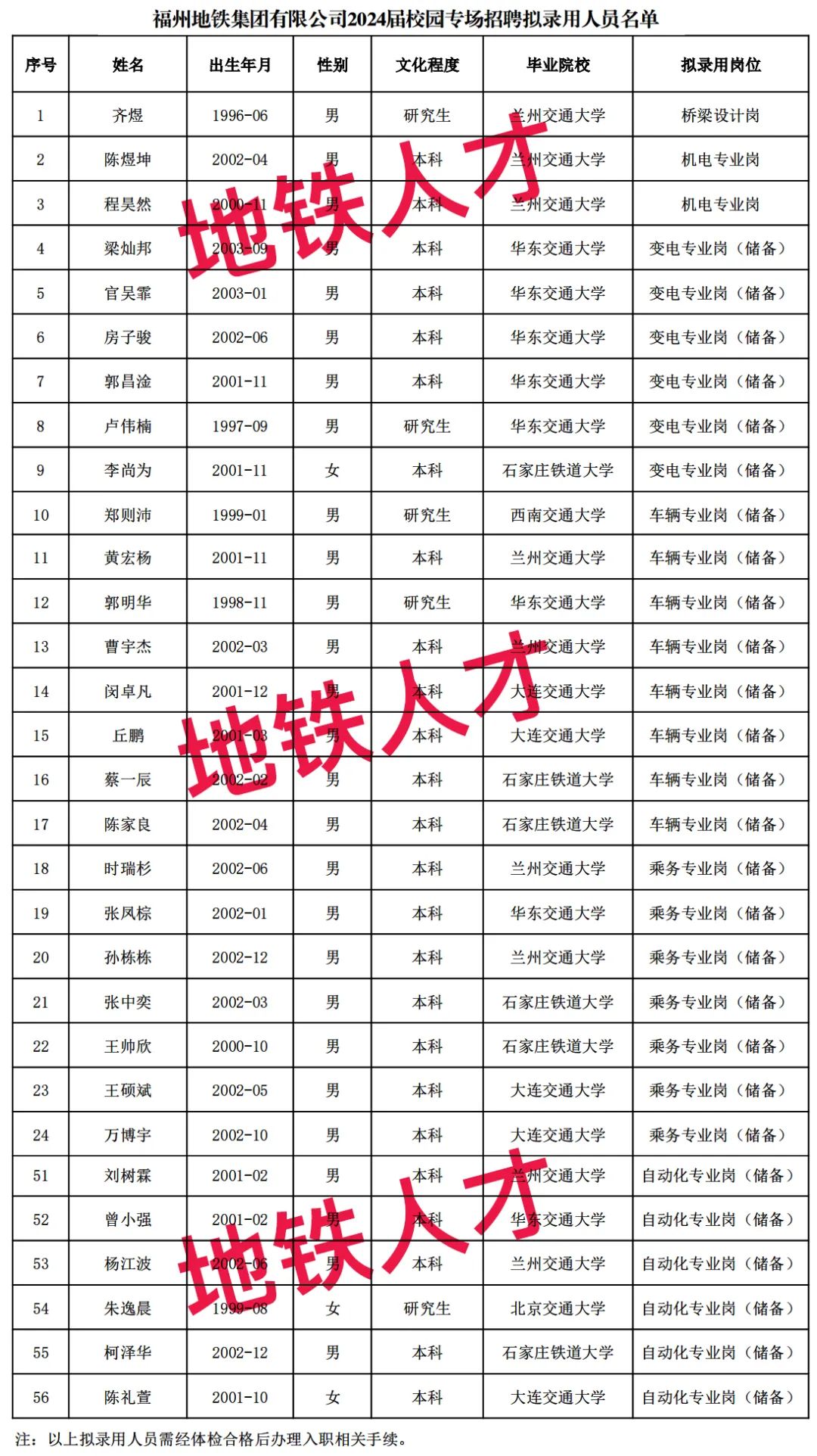 1、福州地铁集团有限公司2024届校园专场招聘拟录用人员公示