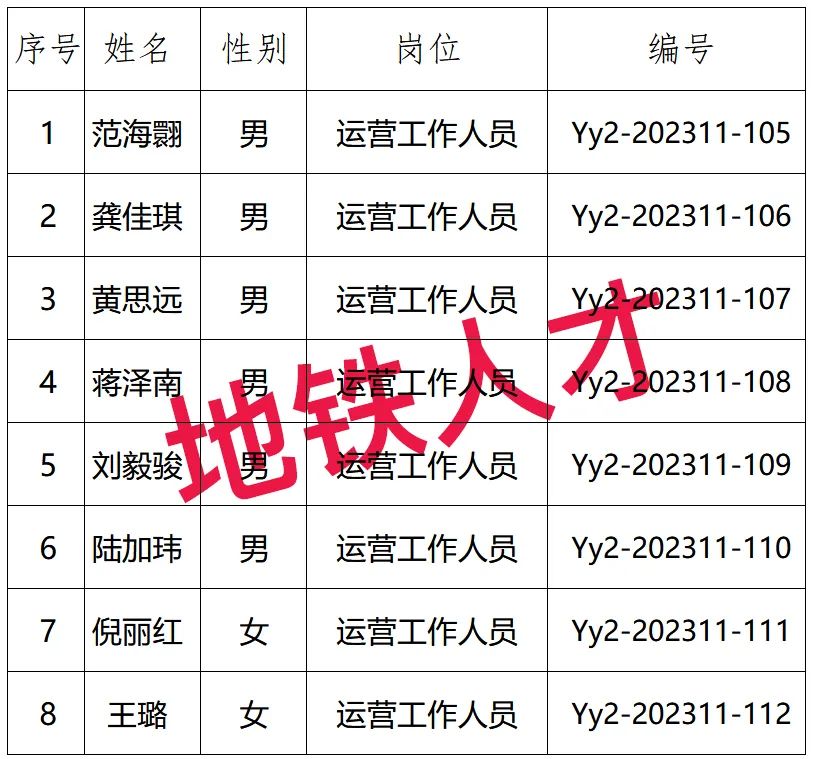 4、12人!上海地铁第三运营有限公司2023年10月招聘录取名单公告