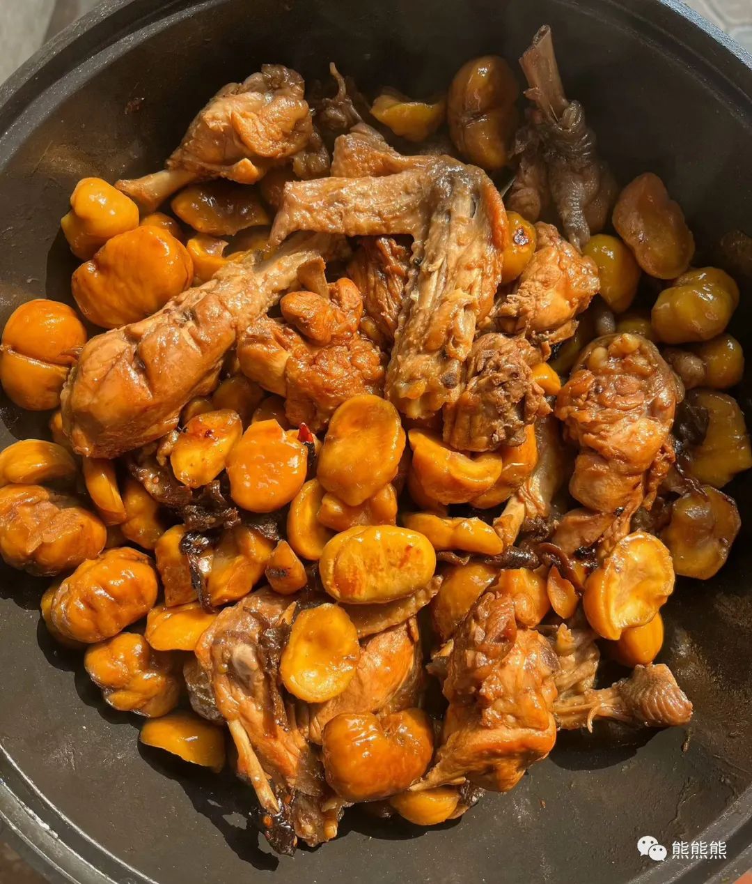 板栗要是买得好,那是入口即化,嚼到嘴里令人目眩神迷。尤其是吸收了很多鸡油的板栗,脂肪+碳水是人类永恒的幸福快乐源泉。