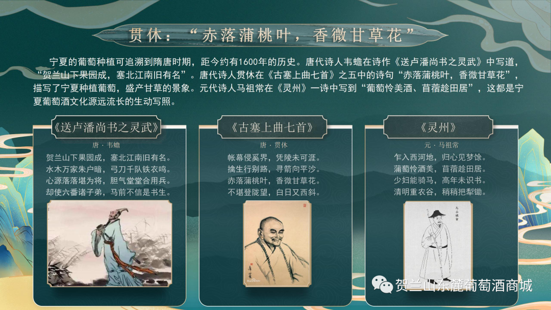宁夏的葡萄种植可追溯到隋唐时期,距今约有1600年的历史。唐代诗人韦蟾在诗作《送卢潘尚书之灵武》中写道,“贺兰山下果园成,塞北江南旧有名”。唐代诗人贯休在《古塞上曲七首》之五中的诗句“赤落蒲桃叶,香微甘草花”,描写了宁夏种植葡萄,盛产甘草的景象。元代诗人马祖常在《灵州》一诗中写到“葡萄怜美酒、苜蓿趁田居”,这都是宁夏葡萄酒历史文化源远流长的生动写照。