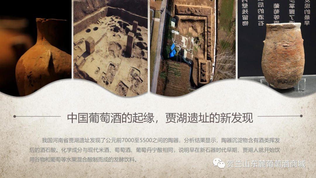 我国河南省贾湖遗址发现了公元前7000至5500之间的陶器,分析结果显示,陶器沉淀物含有酒类挥发后的酒石酸。化学成分与现代米酒、葡萄酒、葡萄丹宁酸相同,说明早在新石器时代早期,贾湖人就开始饮用谷物和葡萄等水果混合酿制而成的发酵饮料。