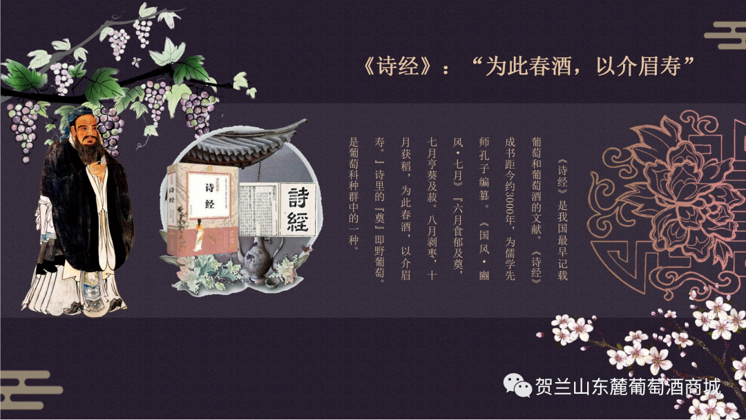《诗经》是我国最早记载葡萄和葡萄酒的重要文献。《诗经》成书距今约3000年,为儒学先师孔子编篡。《国风·豳风·七月》“六月食郁及奠,七月亨葵及菽。八月剥枣,十月获稻,为此春酒,以介眉寿。”诗里的“奠”即野葡萄。是葡萄科种群中的一种。