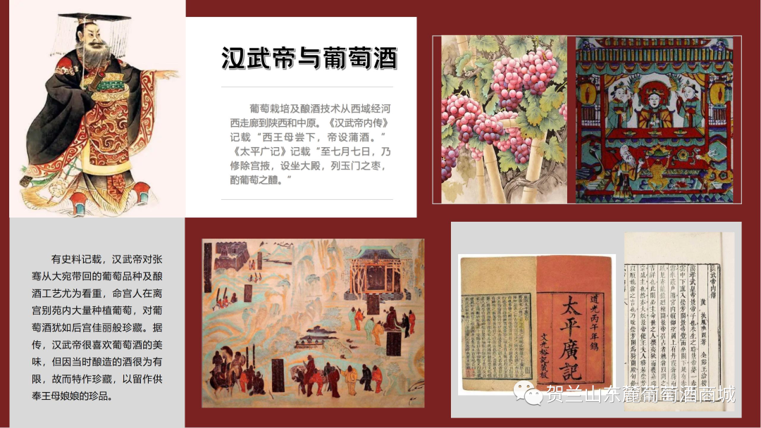 葡萄栽培及酿酒技术从西域经河西走廊到陕西和中原。《汉武帝内传》记载“西王母尝下,帝(指汉武帝)设蒲酒。”《太平广记》记载“至七月七日,乃修除宫掖,设坐大殿,列玉门之枣,酌葡萄之醴。”
