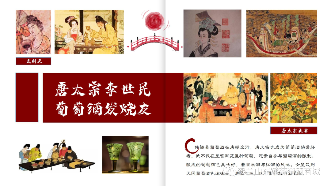 伴随着葡萄酒在唐朝流行,唐太宗李世民也成为葡萄酒的爱好者,他不仅在御苑里种葡萄,还亲自参与葡萄酒的酿制。酿成的葡萄酒色美味好,兼有米酒与红酒的风味。女皇武则天因葡萄酒色浓味美,调理气血,也非常喜欢喝葡萄酒。