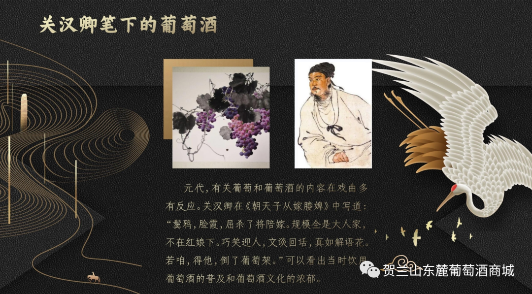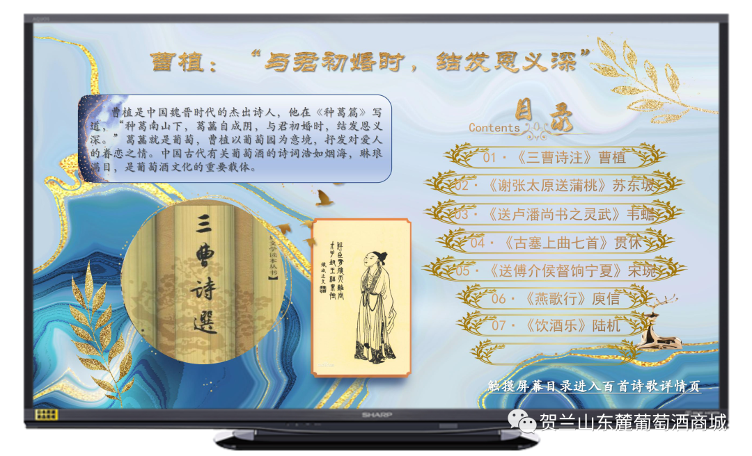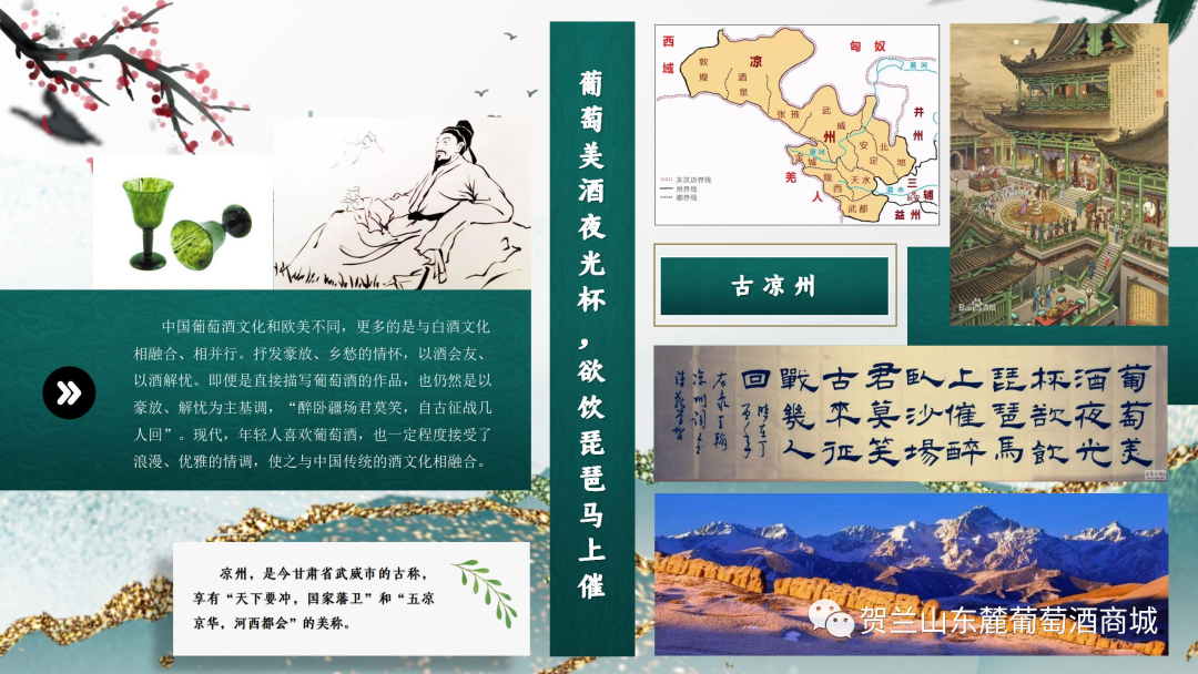 曹植是中国魏晋时代的杰出诗人,他在《种葛篇》写道,“种葛南山下,葛藟自成阴,与君初婚时,结发恩义深。”葛藟就是葡萄,曹植以葡萄园为意境,抒发对爱人的眷恋之情。中国古代有关葡萄酒的诗词浩如烟海,琳琅满目,是葡萄酒文化的重要载体。