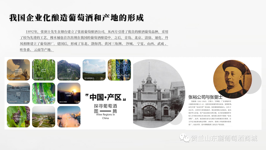 1892年,张弼士先生在烟台建立了张裕葡萄酿酒公司,从西方引进了优良的酿酒葡萄品种,采用了较为先进的工艺,橡木桶也首次出现在我国的葡萄酒酿造中。之后,青岛、北京、清徐、通化、丹凤相继建立了葡萄酒厂。建国后,形成了东北、渤海湾、黄河三角洲、 沙城、 宁夏、山西、武威 、吐鲁番、 云南等产地。