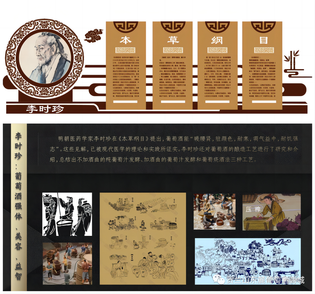 明朝医药学家李时珍在《本草纲目》提出,葡萄酒能“暖腰肾,驻颜色,耐寒,调气益中,耐饥强志”。这些见解,已被现代医学的理论和实践所证实。李时珍还对葡萄酒的酿造工艺进行了研究和介绍,总结出不加酒曲的纯葡萄汁发酵、加酒曲的葡萄汁发酵和葡萄烧酒法三种工艺。