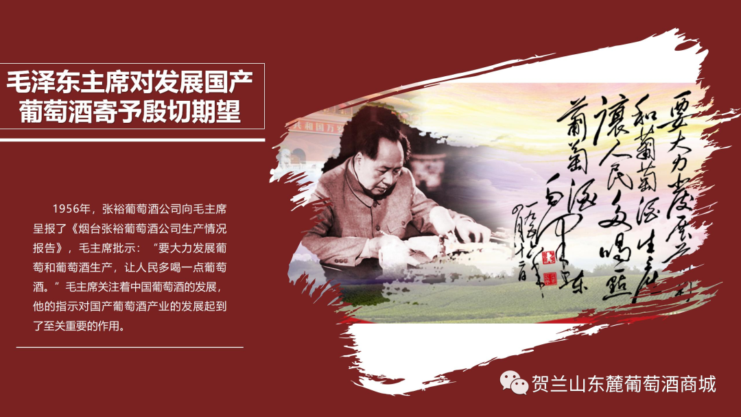 1956年,张裕葡萄酒公司向毛主席呈报了《烟台张裕葡萄酒公司生产情况报告》,毛主席批示:“要大力发展葡萄和葡萄酒生产,让人民多喝一点葡萄酒。”毛主席关注着中国葡萄酒的发展,他的指示对国产葡萄酒产业的发展起到了至关重要的作用。