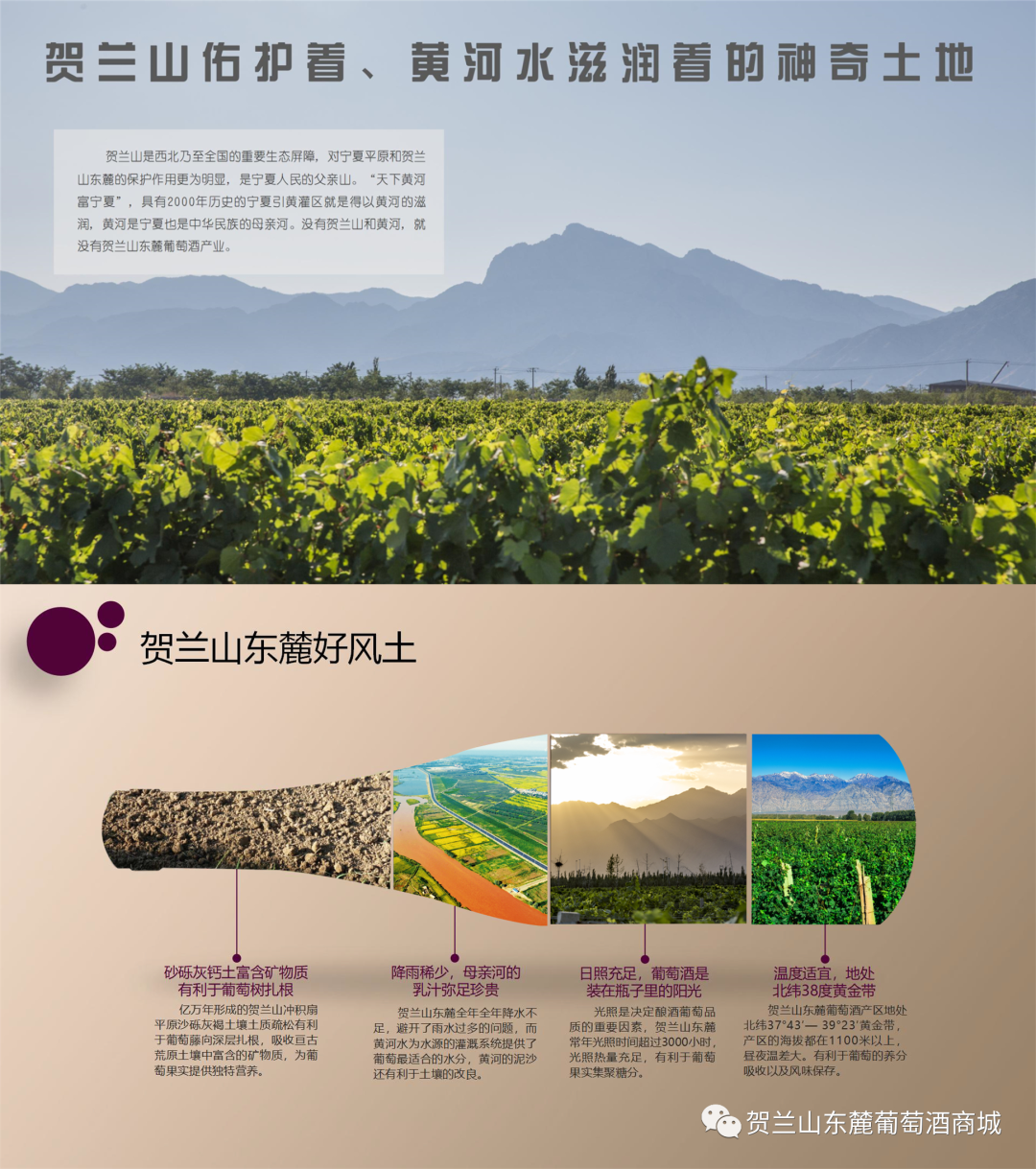 贺兰山东麓葡萄酒产区地处北纬37°43′— 39°23′黄金带,风土条件得天独厚,气候干燥少雨、光照热量充足、昼夜温差大。特别是贺兰山冲积扇平原砂石土壤透气性好、土质疏松有利于葡萄藤向深层扎根,为葡萄果实提供独特营养。