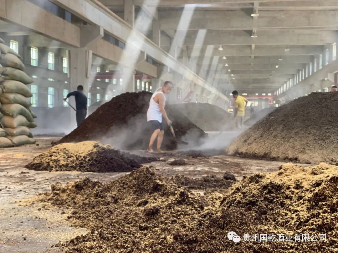 下沙之前要先选用合适的曲块,不论用新曲还是用厚曲都要在使用之前“粉碎”备用,越碎越好。下沙的第一步是“润沙”,即用100摄氏度左右的开水清洗几遍,一方面可以洗去渣滓,另一方面可以让高粱吸水。然后,将高粱上甑蒸煮,大约两个小时。然后散在地上“摊凉”,由铲子不停地翻开,温度降至35摄氏度左右开始加曲。高粱与酒曲的总体比例为1∶1,但是酒曲要分9次加入,每次加的数量都不一样,平均为高粱的10%上下。第一次加曲搅拌后要进行“收堆”发酵,称为阳发酵,即将酒糟堆成一个两米多高的圆锥。发酵时间需要酿酒师依据温度灵活掌握,堆子的内部先开始发热,然后传递到外面。这期间酒糟充分吸纳外围空气中的微生物。酱酒讲究高温发酵,一般外层温度达到五六十摄氏度才结束这一环节,酿酒师把手插进堆子,依据烫手的程度进行判断。第一次阳发酵完成后,把酒曲铲入窖坑进行封存——进入阴发酵。窖坑有3~4米深,能装15~20甑的酒糟。窖底还要撒酒引子,窖坑面要用本地土泥封住,不能透气。