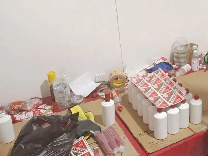 最后,民警在北京、福建两地展开集中收网行动,捣毁制假窝点2处、生产线2条,查获的假冒高端白酒品牌涉及茅台、五粮液等6个品牌,合计88箱共530瓶。同时,还查封了散装白酒(用于灌装)约380斤,商标标识、包装盒(袋)、空酒瓶等各类制假物资若干。经初步调查统计涉案金额高达1000余万元。