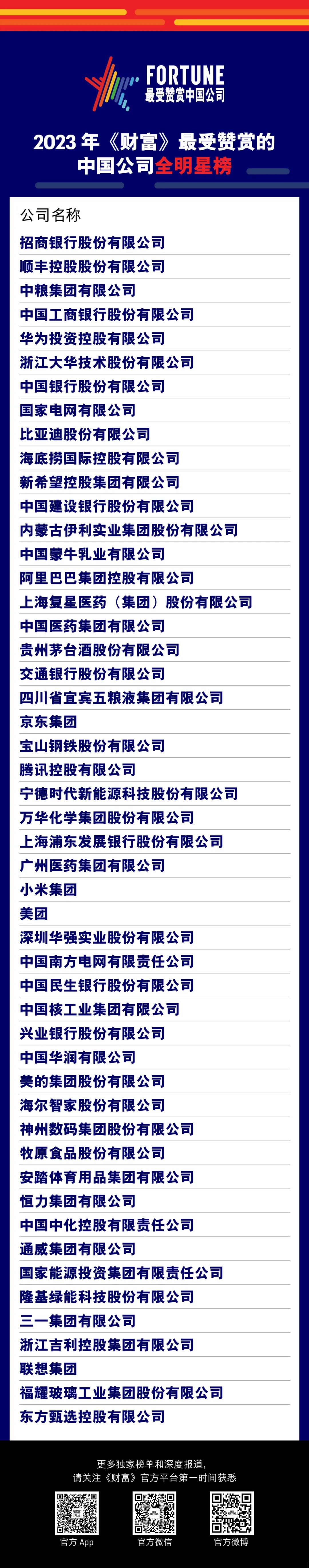 第二部分是受访者在所有的侯选公司中不分行业选出心目中最受推崇的公司,与编辑部评分加权计算后,综合得分最高的50家公司荣登“《财富》最受赞赏的中国公司”全明星榜。在任何情况下,接受调查者都不得选择自己所在的公司。
