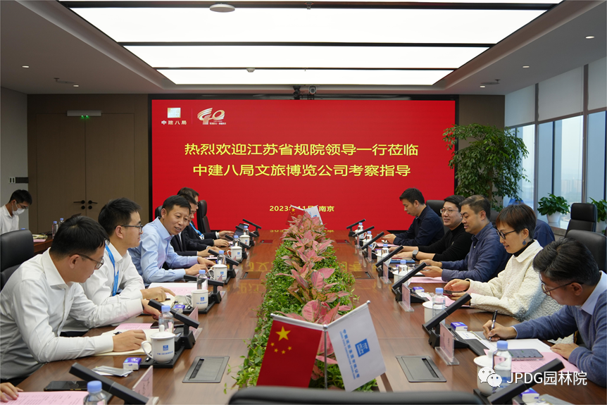 邢利兵副总经理对朱兴彤副院长一行的来访表示欢迎,带领朱兴彤副院长一行参观八局文旅公司企业展厅,并对公司成立背景、发展战略及主要业务等进行了介绍。高升院长介绍了公司在文旅项目上的运营策划和投资建设情况,重点介绍了八局投资建设的南京牛首山金陵小镇投资模式及运营情况。朱兴彤副院长介绍了集团园林院发展概况、生产经营工作,重点回顾了双方在南京园博会、连云港园博会等项目合作上取得的成就。陶亮副所长、曹隽副总工程师分别介绍了园林院在江苏园博园领域的业务开展情况。