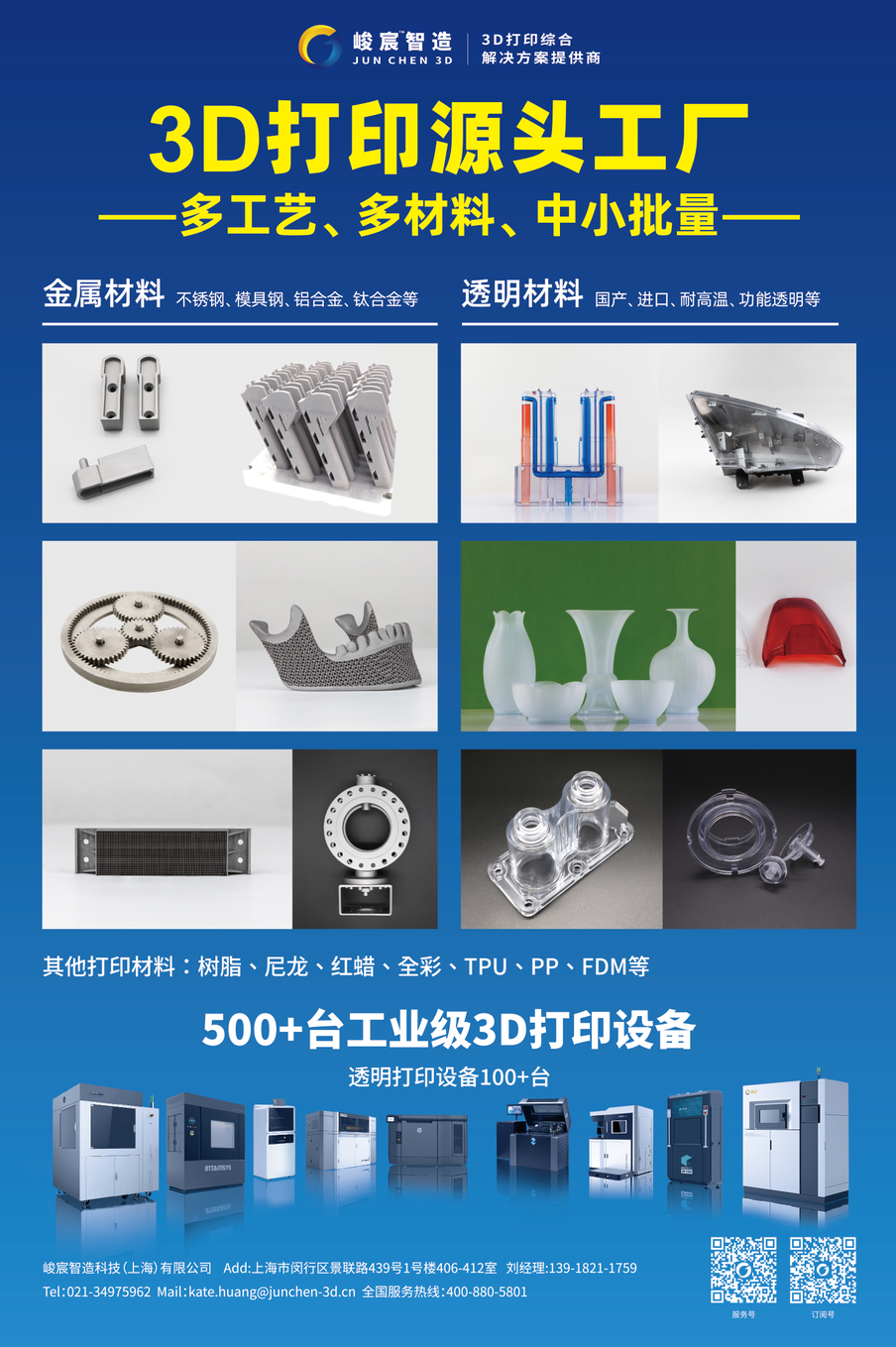 峻宸集团总部位于上海闵行区,一家专注于三维打印服务及技术应用的高科技企业,公司拥有400+台工业级3D打印设备,打印材料涵盖树脂、尼龙、金属、全彩、红蜡FDM等40多种,15000+㎡的生产规模,全国已布局七个分点(上海闵行总部、上海松江分部、浙江|宁波分部、江苏|苏州分部、江苏|南通分部、河南|郑州分部、广东|东莞分部、天津分部)均配备接单到生产一站式服务。国内早期引进全彩3D打印机并且装机体量较大的3D打印服务商之一、SLA-3D打印透明(透明材料打印设备占国内服务领域50%+),能够快速为客户提供专业的“设计与制造”综合解决方案和产品定制的批量打印服务商。