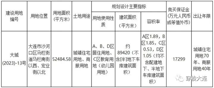 按照规划设计主要指标要求,该地块建筑面积约52484.58平方米,A区容积率为1.89,B区容积率为1.85,C区容积率为0.53,D区容积率为1.05。竞买保证金为17299万元人民币或等值外币。