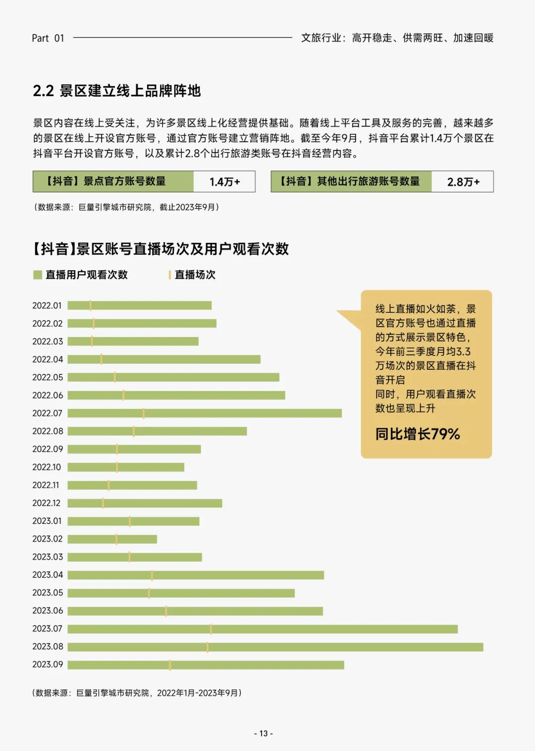 旅游业的复苏重启也促进景区市场景气。截止 2022 年末,中国共有 A 级旅游景区 14917 个,其中 5A 级旅游景区 318 个。一处景点带火一座城,这样的现象在抖音平台层见迭出,抖音也成为人们种草美好目的地的渠道,线上内容在景区游玩经营中越来越重要。