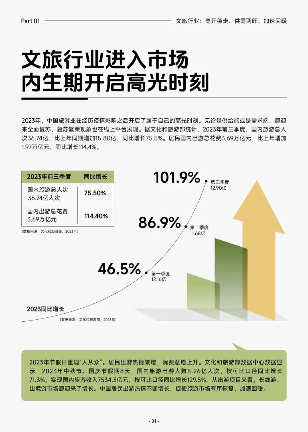 2023 年,中国旅游业在经历疫情影响之后开启了属于自己的高光时刻。无论是供给端或是需求端,都迎来全面复苏,复苏繁荣现象也在线上平台展现。据文化和旅游部统计,2023 年前三季度,国内旅游总人次 36.74 亿,比上年同期增加 15.80 亿,同比增长 75.5%。居民国内出游总花费 3.69 万亿元,比上年增加 1.97 万亿元,同比增长 114.4%。