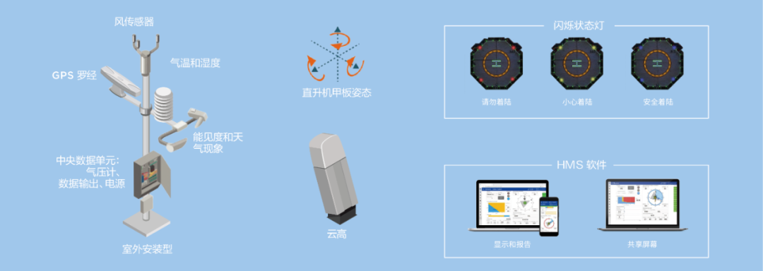 ①CAP 437要求的气象和环境测量装置包括维萨拉的风速和风向、气压、气温、露点、相对湿度、水平能见度、云高云量传感器,还要求安装集成闪烁状态灯和姿态感应装置。