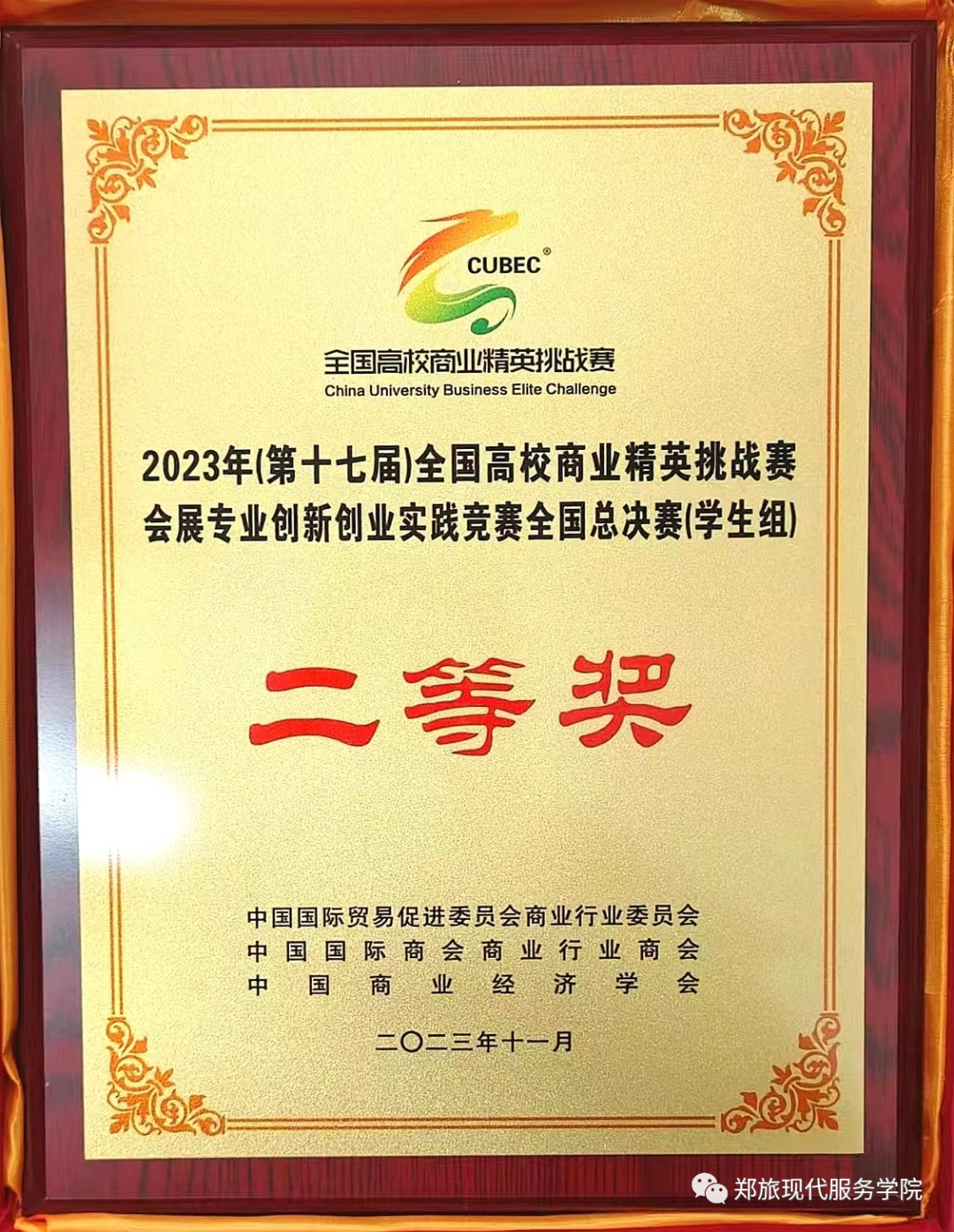 2022级会展策划与管理专业学生在2023年全国高校商业精英挑战赛会展专业创新创业实践竞赛全国总决赛中再获佳绩。2023年11月11日,由中国国际贸易促进委员会商业行业委员会、中国国际商会商业行业商会与中国商业经济学会共同主办的2023年第十七届全国高校商业精英挑战赛会展专业创新创业实践竞赛成功举办。该竞赛最终有来自全国30个省、市、自治区、直辖市和特别行政区(澳门)的360所高校2047支(学生组1987、教师组60)参赛队伍,10239名参赛选手和辅导教师入围全国总决赛。