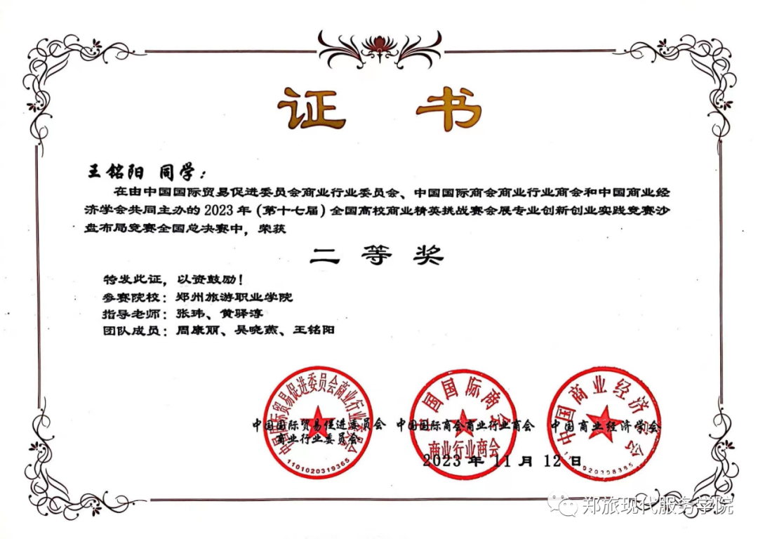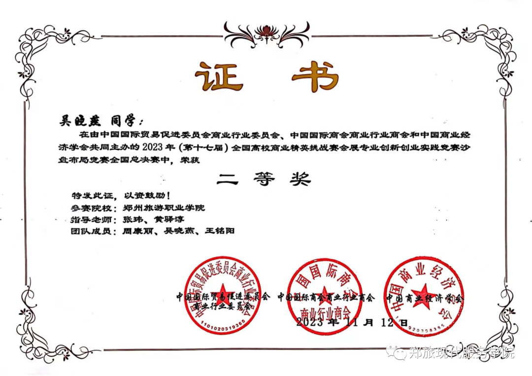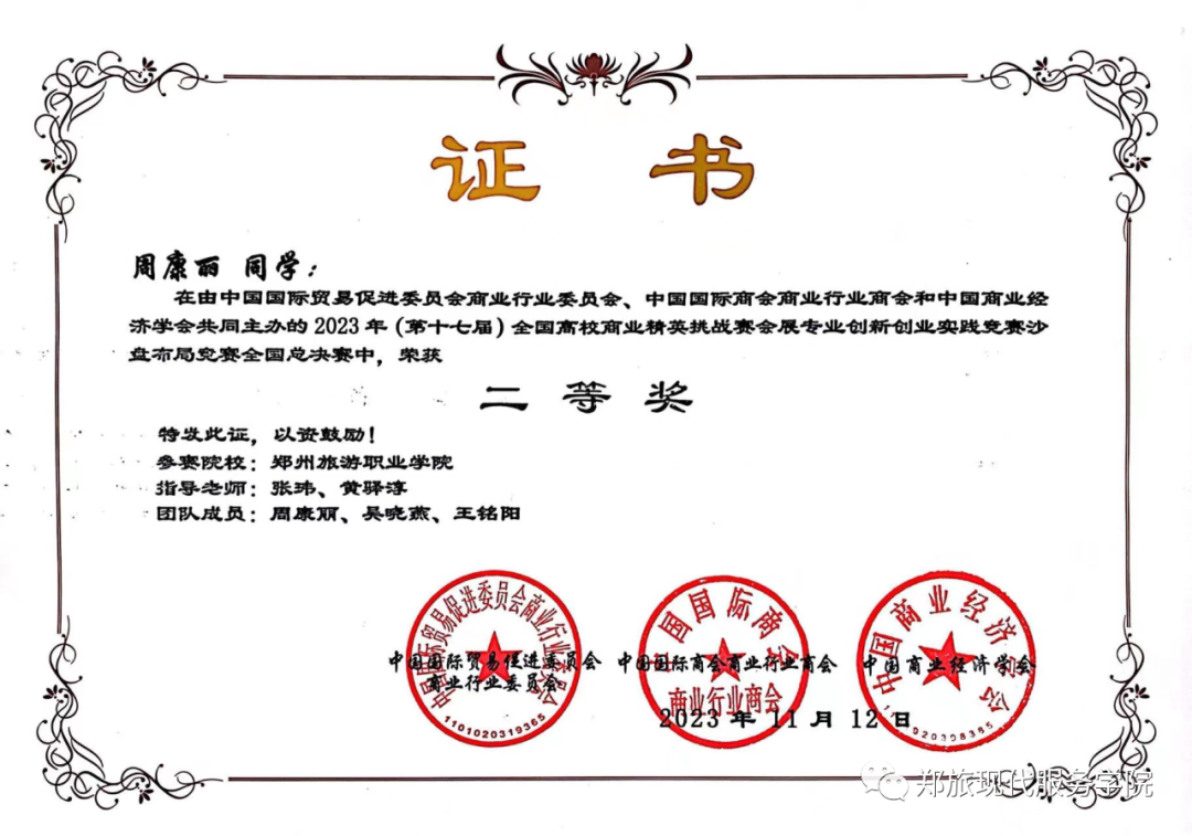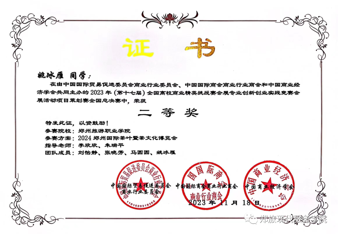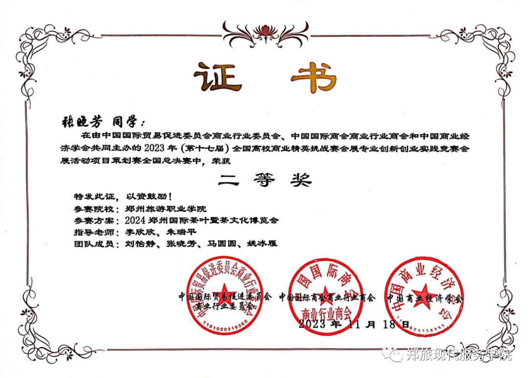 2023年11月11日,经过一天激烈角逐,现代服务学院会展专业2支参赛团队从1987支学生参赛队伍中脱颖而出,均取得国赛二等奖的好成绩。1支参赛队伍在会展活动项目策划赛全国总决赛中荣获二等奖,参赛成员由刘怡静、张晓芳、马圆圆和姚冰雁四位同学组成,作品名称为《2024郑州国际茶叶暨茶文化博览会》,指导教师为李欣欣和朱瑞平;1支参赛队伍在沙盘布局竞赛全国总决赛中荣获二等奖,参赛成员由周康丽、吴晓燕和王铭阳三位同学组成,作品展示的是自创潮牌“酷●视”眼镜活动展台,指导老师为张玮和黄驿淳。