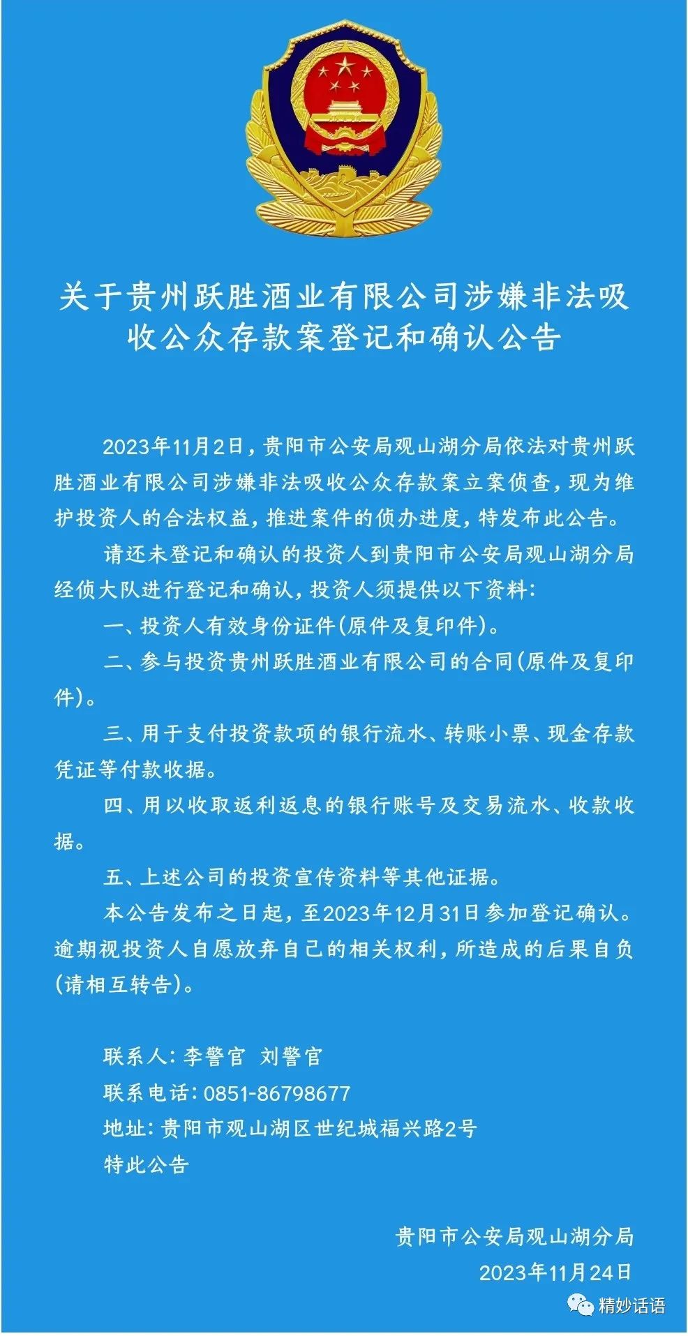 2023年11月24日,贵阳市公安局观山湖分局对外发布了关于贵州跃胜酒业有限公司涉嫌非法吸收公众存款案登记和确认公告。具体如下: