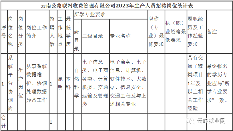 附件:云南公路联网收费管理有限公司生产人员招聘岗位统计表
