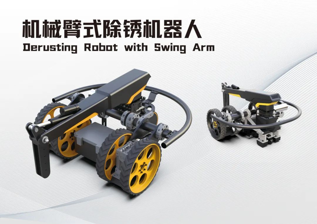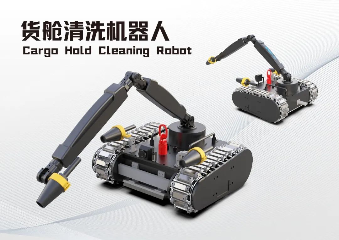 适用于散货船的货舱清洗作业。机器人尺寸满足舱内各结构的通行需要,重量轻,可以单人进行搬运,机器人配有一个三自由度机械臂以及两组清洗喷头,满足货舱肋骨、横舱壁等复杂结构的清洗需求,可选配中压水清洗系统直接采用海水进行作业。