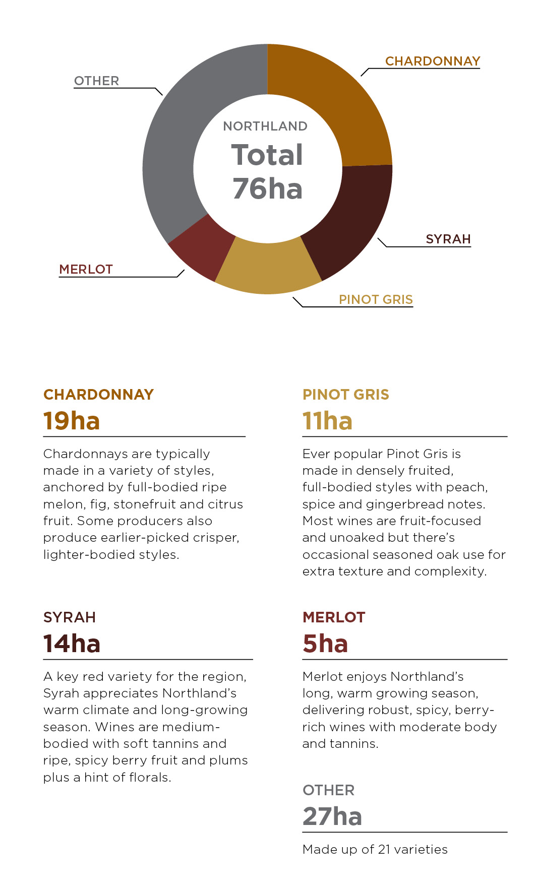 温暖的春季、炎热干燥的夏季和平静晴朗的秋季使得果实成熟较早,酿出的葡萄酒酒体饱满、口感丰富。相对于这个国家的其他葡萄种植区来说,北部地区的葡萄藤接受到的热量较多,能够在生长季让葡萄更好地成熟。从北部的卡里卡里(Karikari)延伸至南部的芒格怀海德(Mangawhai),北部地区的每一处葡萄园的朝向、土壤和微气候都是独一无二的。